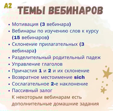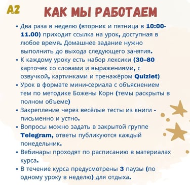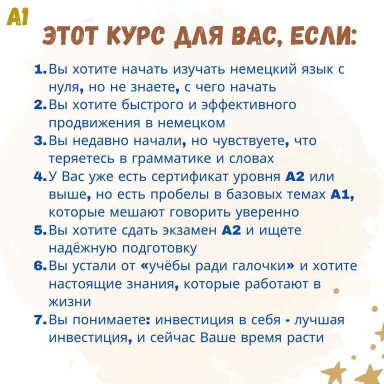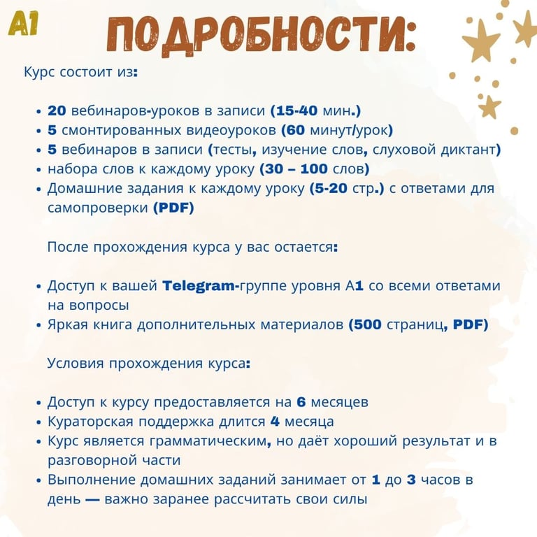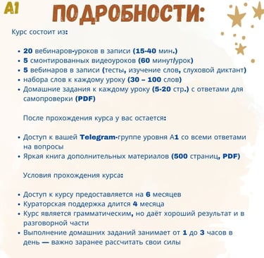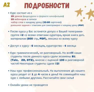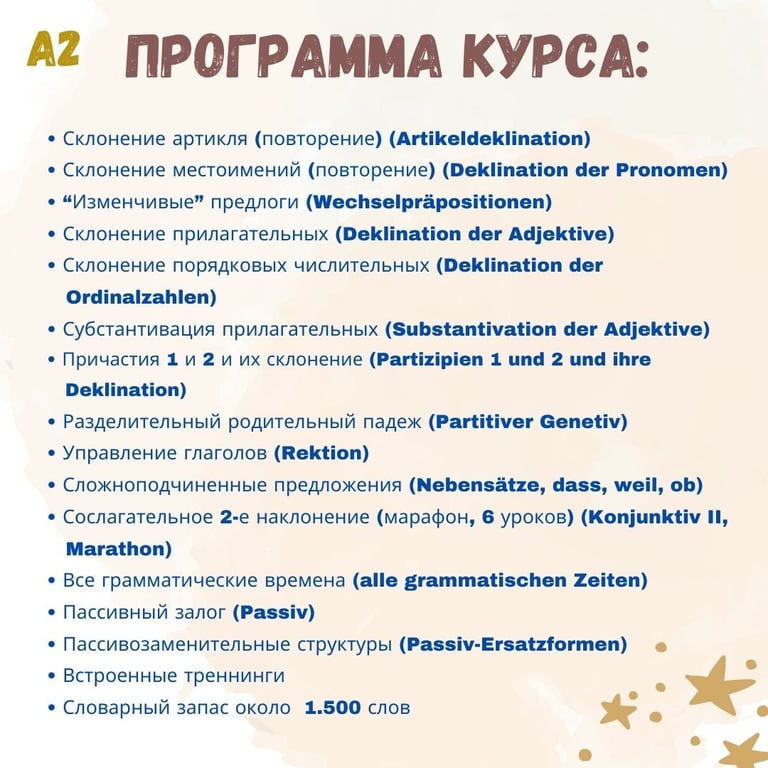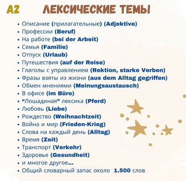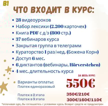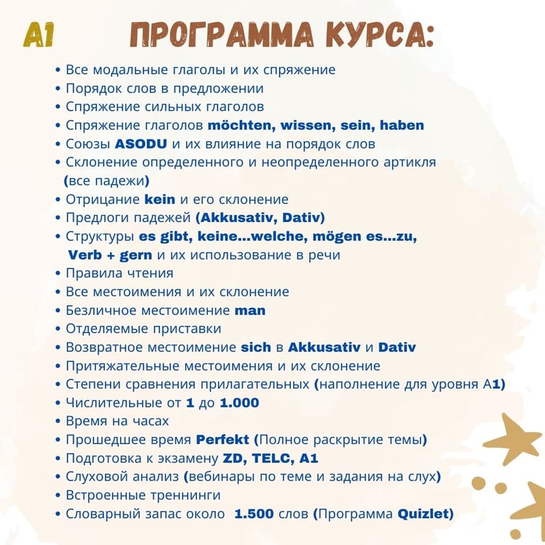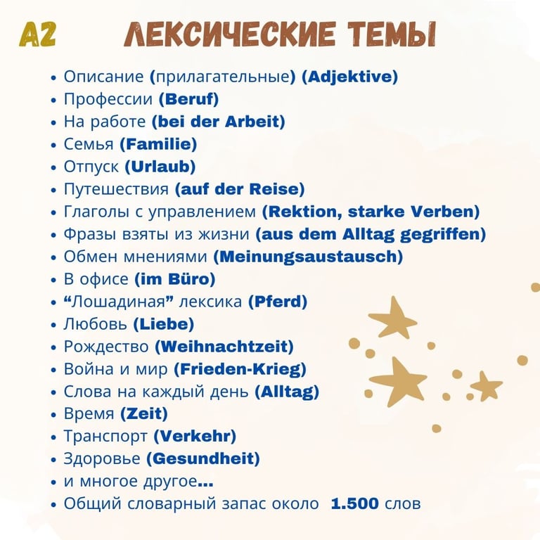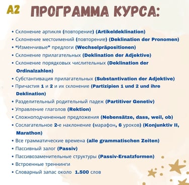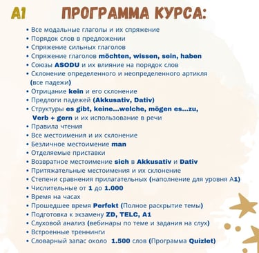 Вы углубите базовые знания грамматики, расширите словарный запас для повседневного общения, научитесь понимать простые тексты и аудио, писать короткие сообщения и выражать свои мысли на знакомые темы. Присоединяйтесь к Deutsch mit Bozena Korn и сделайте уверенный шаг в изучении немецкого!