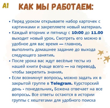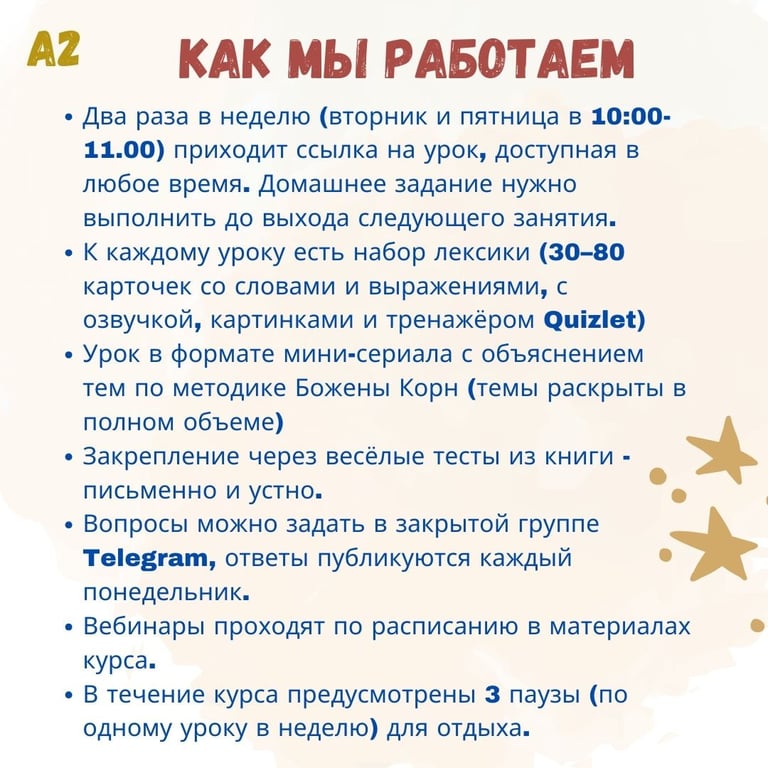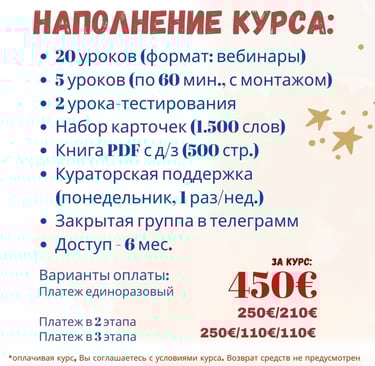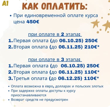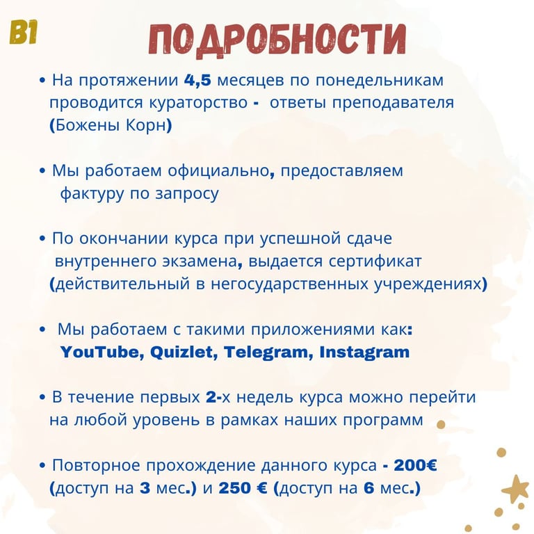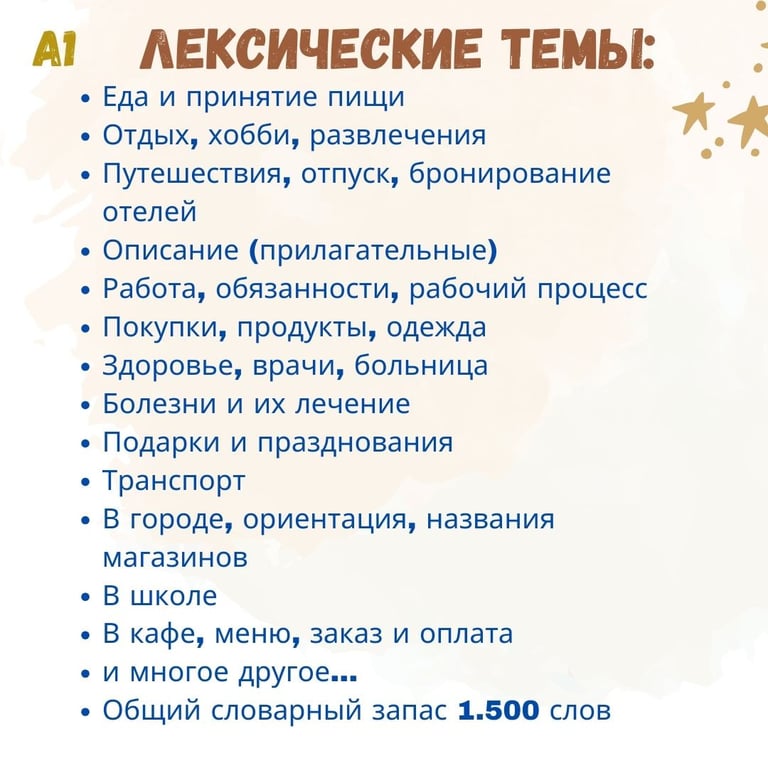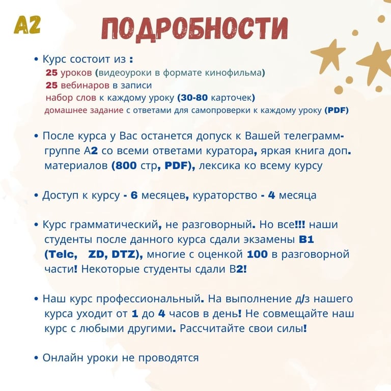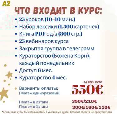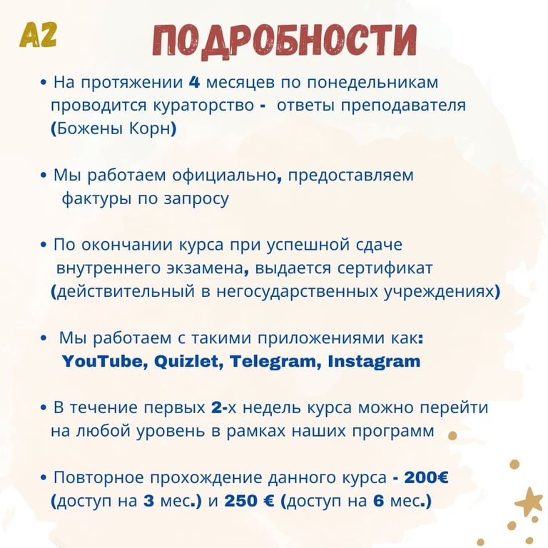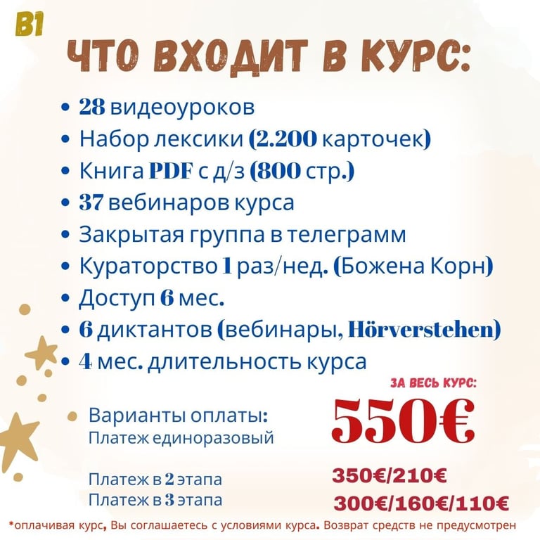 Вы углубите базовые знания грамматики, расширите словарный запас для повседневного общения, научитесь понимать простые тексты и аудио, писать короткие сообщения и выражать свои мысли на знакомые темы. Присоединяйтесь к Deutsch mit Bozena Korn и сделайте уверенный шаг в изучении немецкого!