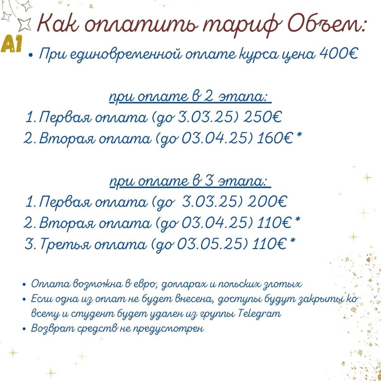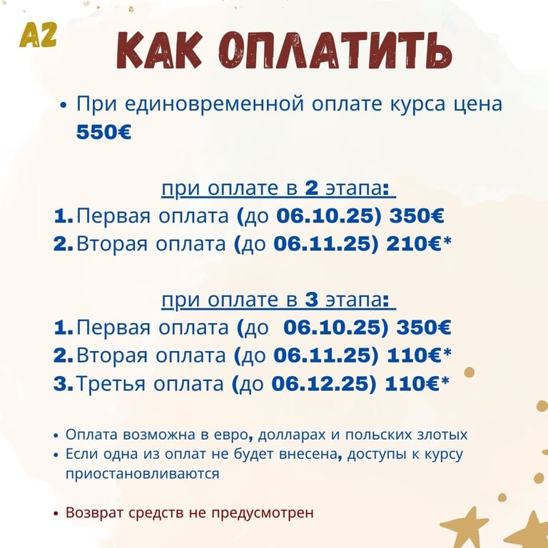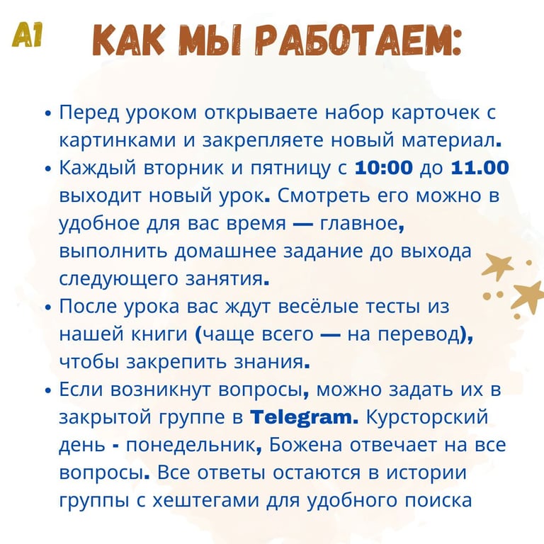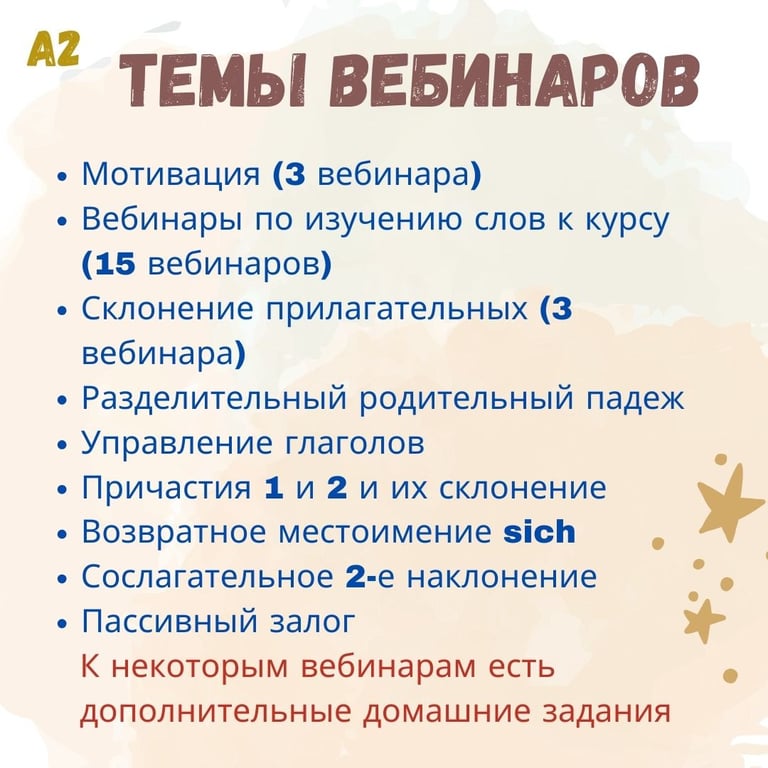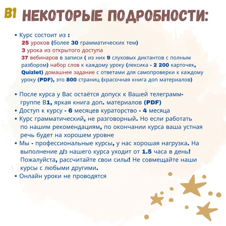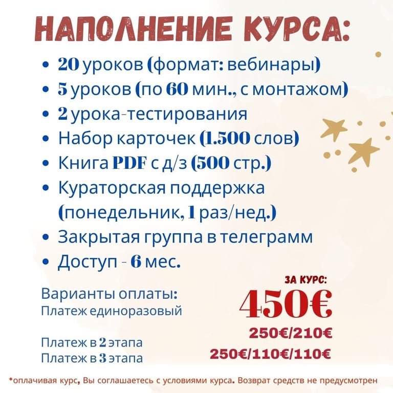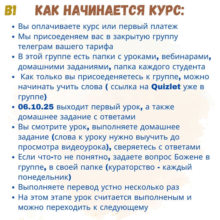 Вы углубите базовые знания грамматики, расширите словарный запас для повседневного общения, научитесь понимать простые тексты и аудио, писать короткие сообщения и выражать свои мысли на знакомые темы. Присоединяйтесь к Deutsch mit Bozena Korn и сделайте уверенный шаг в изучении немецкого!