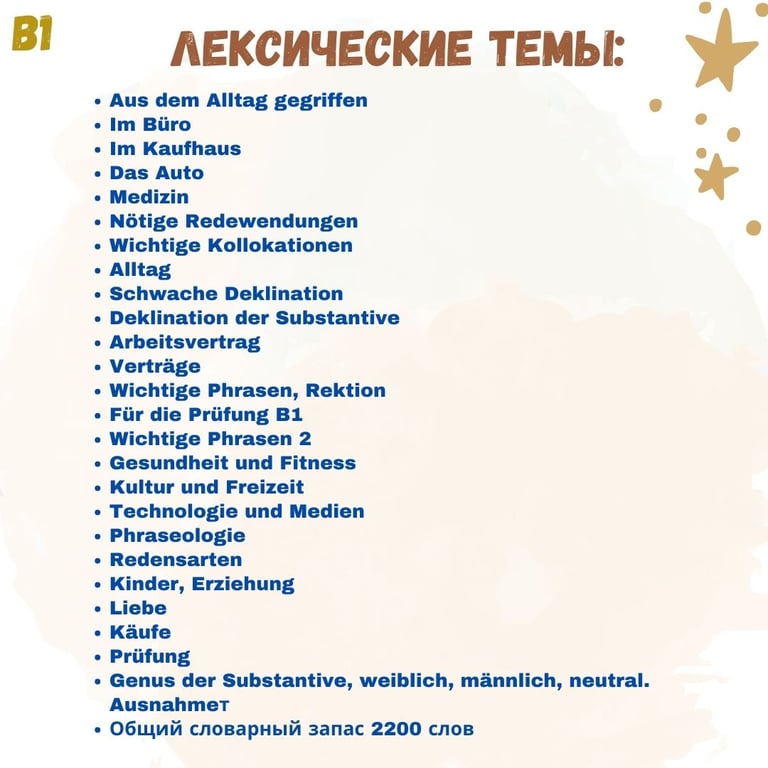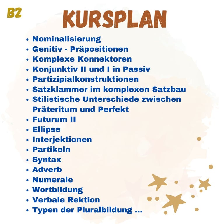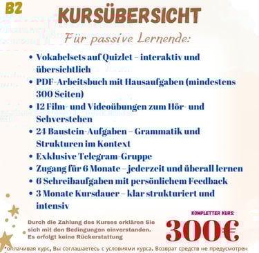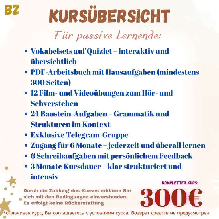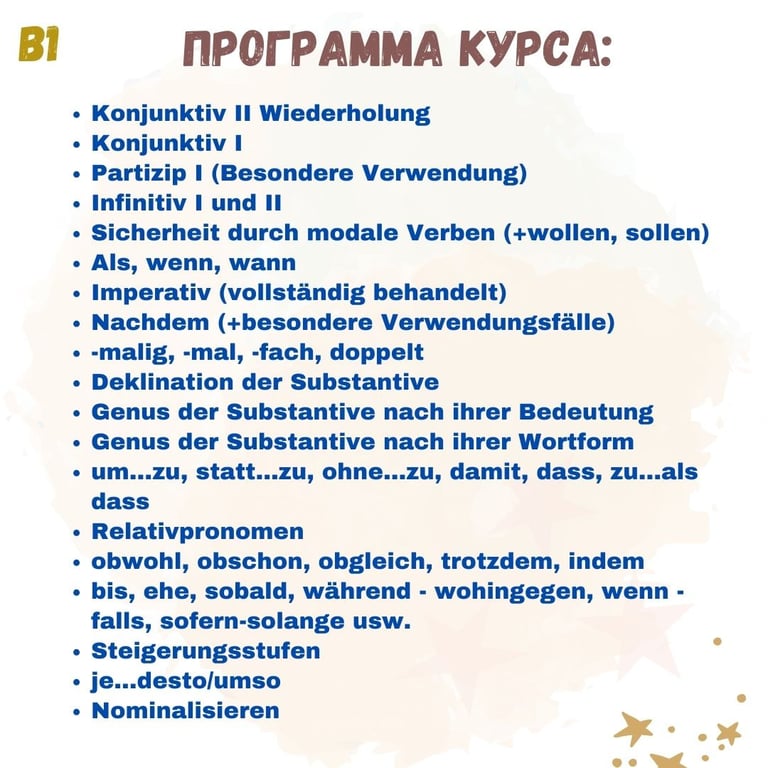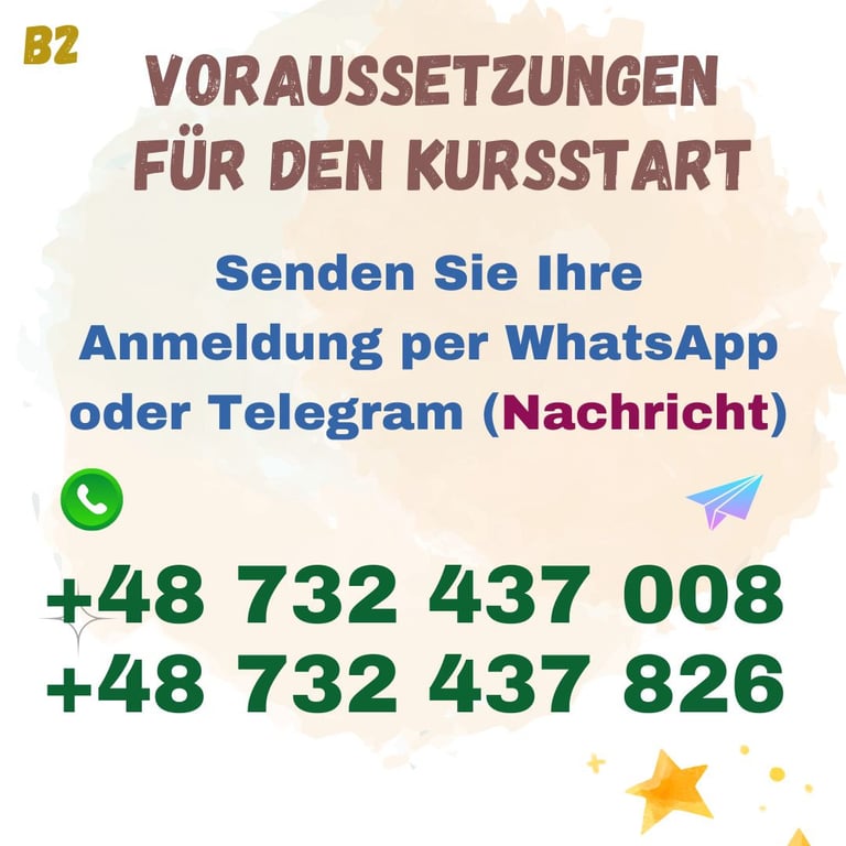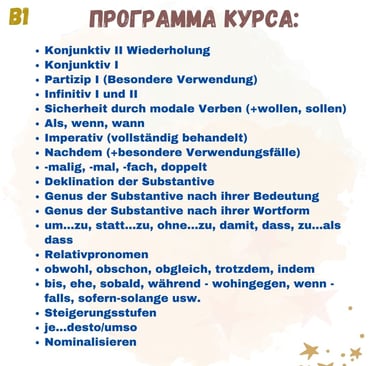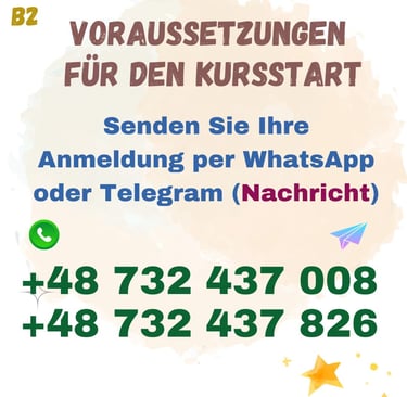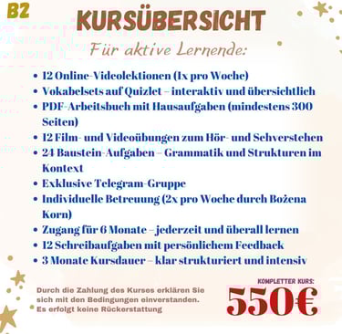 Курс для тех, кто хочет углубить свои знания и достичь уверенного среднего уровня. Вы освоите сложные грамматические конструкции, расширите словарный запас, научитесь понимать тексты и аудио среднего уровня сложности, писать структурированные письма и уверенно выражать свои мысли на немецком. Присоединяйтесь к Deutsch mit Bozena Korn и продолжайте свой путь к свободному владению языком!