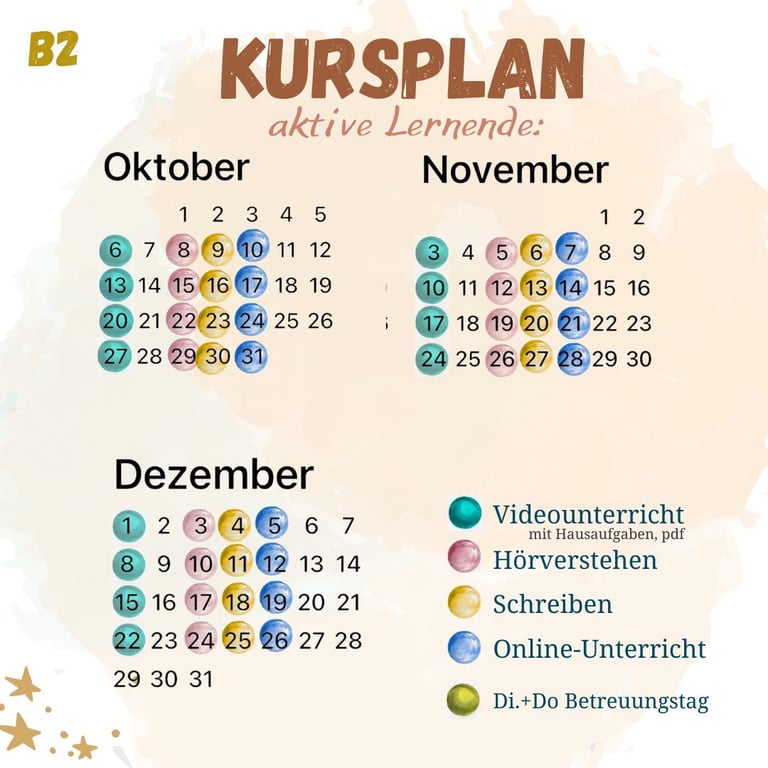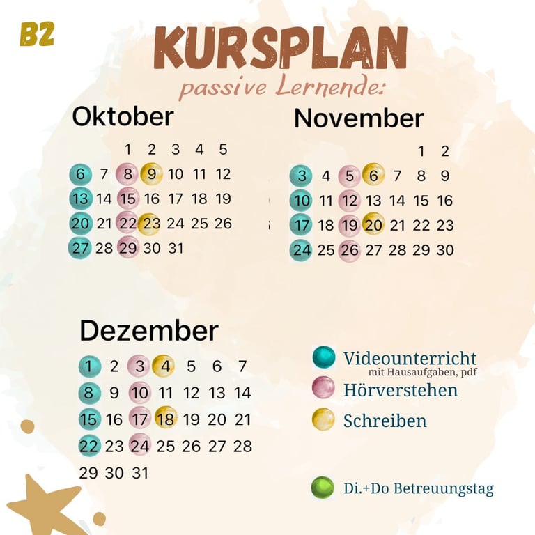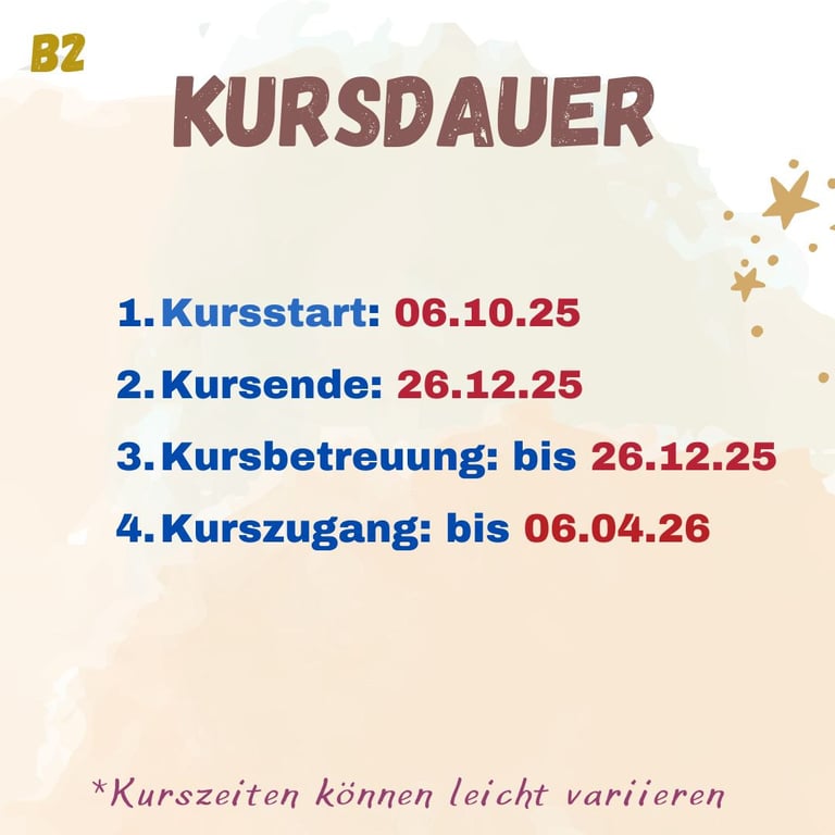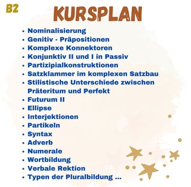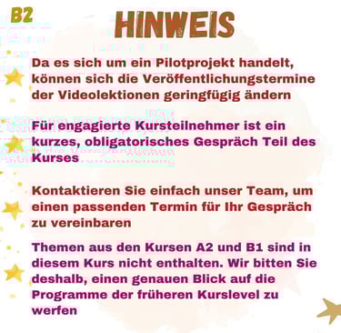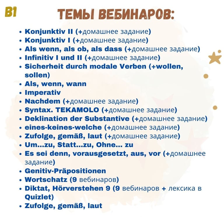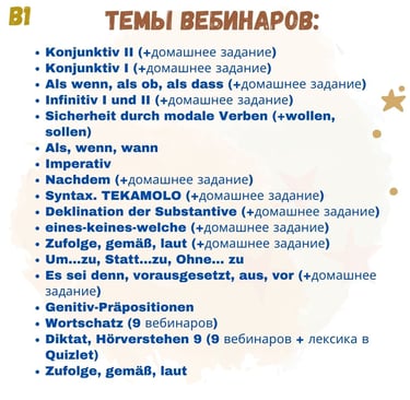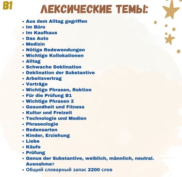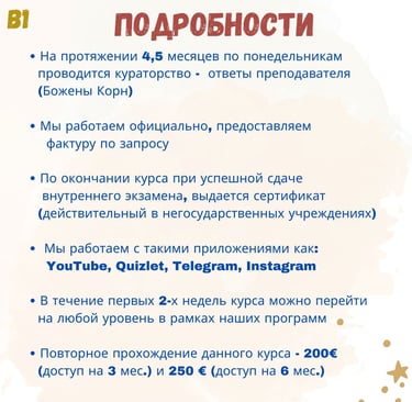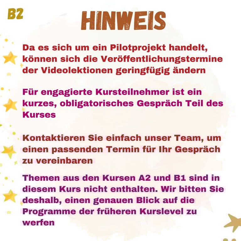 Курс для тех, кто хочет углубить свои знания и достичь уверенного среднего уровня. Вы освоите сложные грамматические конструкции, расширите словарный запас, научитесь понимать тексты и аудио среднего уровня сложности, писать структурированные письма и уверенно выражать свои мысли на немецком. Присоединяйтесь к Deutsch mit Bozena Korn и продолжайте свой путь к свободному владению языком!