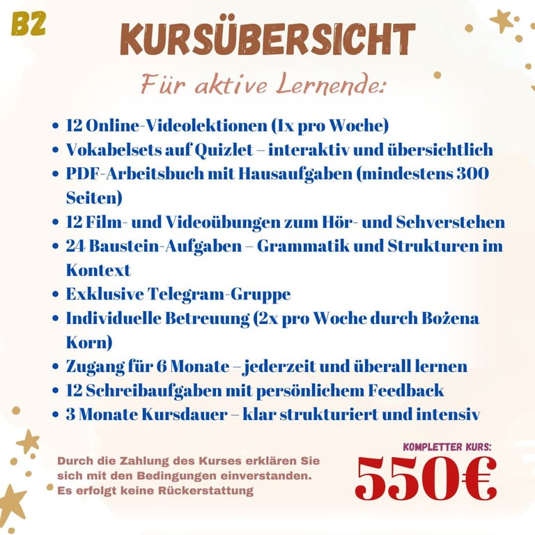 Этот курс поможет вам выйти на уровень B2 — понимать живую речь, свободно поддерживать диалог, выражать своё мнение и аргументировать позицию. Вы отработаете разговорные конструкции, пополните словарный запас и научитесь звучать естественно в разных ситуациях общения. Вместе с Deutsch mit Bozena Korn вы сделаете уверенный шаг к настоящей языковой свободе!